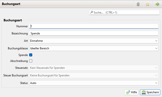 Status: Aktiv bedeutet, dass der Eintrag in Auswahlmenüs zur Eingabe der Buchungsart angezeigt wird. Deaktiviert bedeutet, das die Buchungsart nicht mehr angeboten wird. Das kann Sinn machen wenn man die Buchungsart nicht mehr braucht aber noch alte Buchungen existieren denen sie zugeordnet sind. Bei Auto wird eine Buchungsklasse automatisch ausgeblendet wenn sie mehrere Monate nicht mehr verwendet wurde. Die Anzahl der Monate lässt sich unter Administration->Einstellungen->Buchführung konfigurieren.