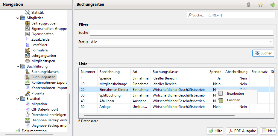 Über das Kontextmenü können bestehende Buchungsarten bearbeitet und gelöscht werden.