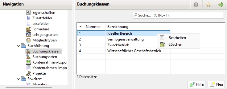 Über das Kontextmenü können bestehende Buchungsklassen bearbeitet und gelöscht werden.