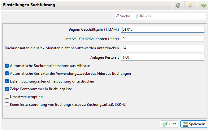 Intervall für aktive Konten. Aktive Konten sind die, deren Auflösung um mehr als die ausgewählte Anzahl von Jahren zurück liegt. Diese können im Kontoauswahl Dialog ausgeblendet werden.