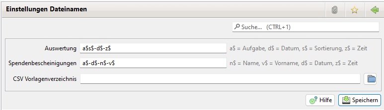 Bei der Ausgabe von Dateien (Abbuchung, Auswertungen...) werden die Dateinamen nach dem vorgegebenen Muster aufgebaut. Es können zusätzliche, vom Betriebssystem unterstützte Zeichen, in das Muster aufgenommen werden. Bleibt das Muster leer, wird kein Vorschlag für den Dateinnamen angezeigt. Spendenbescheinigungen werden jeweils für den einzelnen Spender ausgestellt. Daher sollten zur leichteren Identifizierung Name und Vorname in den Dateinamen aufgenommen werden.