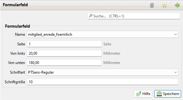 Bei den Formularfelder Buttons klickt Ihr auf "Neu", um das erste einzufügende Datenfeld auszuwählen und zu positionieren: (Die spätere Reihenfolge Eurer Datenfelder ist egal! Ihr könnt auch erst hinten anfangen)