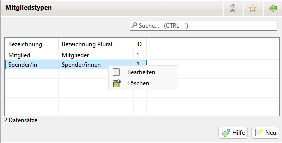 Neben den Mitgliedern können Nicht-Mitglieder gespeichert werden. Die Nicht-Mitglieder werden kategorisiert. Vorgegeben ist der Mitgliedstyp 'Spender/in'. Weitere Mitgliedstypen können hier eingerichtet werden.