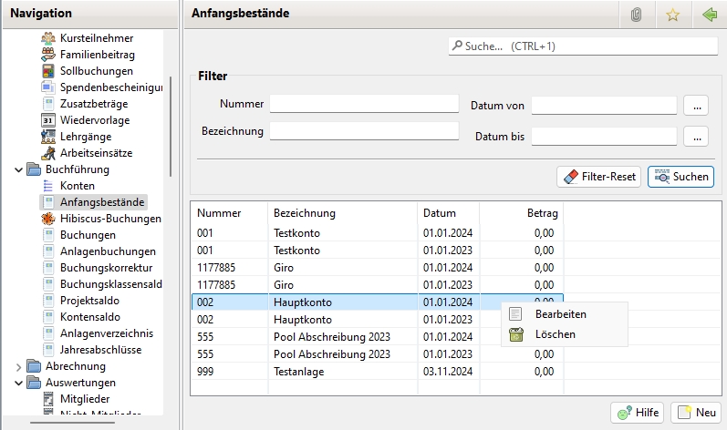 Über den Button Neu werden neue Anfangsbestände aufgenommen. Mit einem Doppelklick auf einen Anfangsbestand kann der Bestand bearbeitet werden. Ein Rechtsklick auf einen Anfangsbestand öffnet ein Kontextmenü. Damit kann ein Anfangsbestand gelöscht werden.