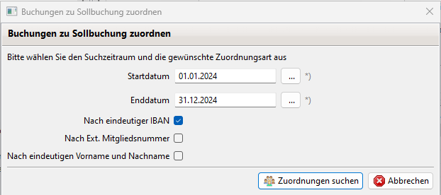 In der Ansicht Buchführung -> Buchungen gibt es den Button "Zuordnung", mit dem eine automatische Zuordnung von Buchungen zu Sollbuchungen vorgenommen werden kann. Diese kann auf Basis einer eindeutigen IBAN, der Mitgliedsnummer im Verwendungszweck und/oder den eindeutigen Vor- und Nachname im Verwendungszweck vorgenommen werden. Über das Start- und Enddatum kann der Suchbereich von aktiven Mitgliedern, Buchungen und Sollbuchungen eingeschränkt werden.