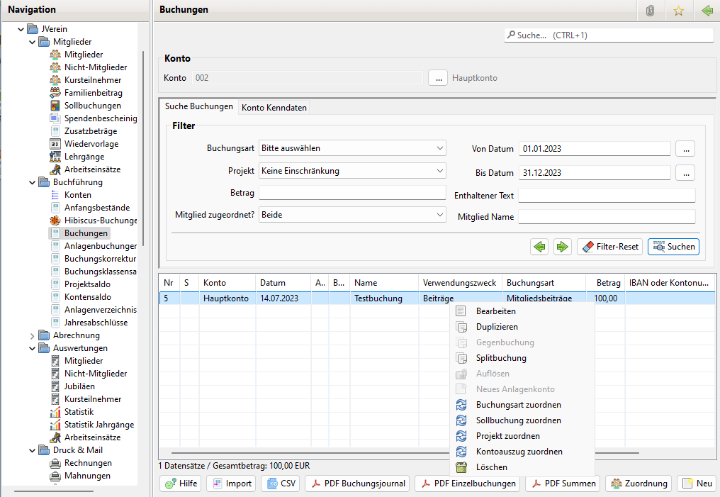 Mit einem Doppelklick auf eine Buchung wird die Detailansicht zur Bearbeitung geöffnet. Mit einem rechten Mausklick öffnet sich ein Kontextmenü. Damit können Buchungen bearbeitet werden und bestehende Buchungen gelöscht werden. Der Export der Daten ins PDF oder CSV Format wird durch einen Klick auf PDF/CSV angestoßen.