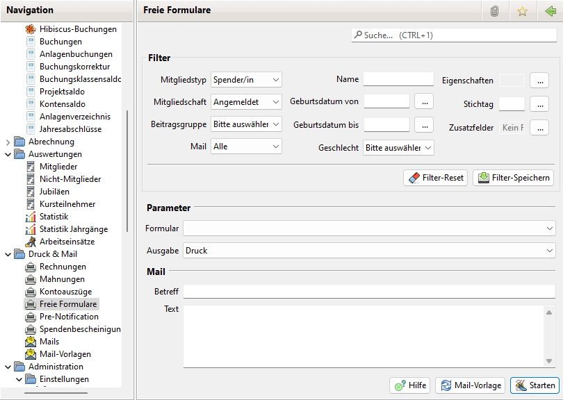 Im Filter Bereich lässt sich einstellen für welche Mitglieder bzw. Nicht-Mitglieder freie Formulare gedruckt oder verschickt werden sollen.