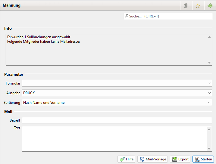 Im Info Feld wird angezeigt wieviele Sollbuchungen selektiert wurden und ob zugehörige Mitglieder keine Mailadresse haben. Haben sie keine Mail Adresse werden sie beim Versand per Mail ignoriert.