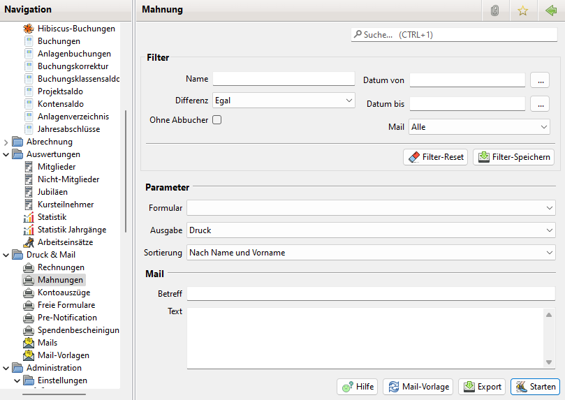 Falls Sie Mahnungen per Mail versenden wollen, wählen Sie erst bei Mail die Option "Nur mit Mailadresse" und als Ausgabe Mail. Damit versenden sie die Mahnung an alle Mitglieder die eine Mail Adresse haben.