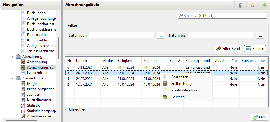 Mit einem Rechtsklick auf den entsprechenden Abrechnungsverlauf öffnet sich ein Kontextmenü, mit dem man die Pre-Notifications erstellen kann.