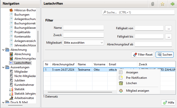 Mit einem Rechtsklick auf eine oder mehrere Lastschriften öffnet sich ein Kontextmenü, mit dem man die Pre-Notifications erstellen kann.