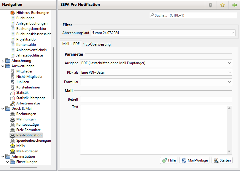 Diese Option hat den Vorteil, dass man einzelne Lastschriften auswählen kann. Da bei wiederkehrenden Lastschriften eine Pre-Notification nur beim ersten Mal notwendig ist, kann man hier nur die Mitglieder auswählen die neu hinzugekommen sind oder bei denen sich etwas geändert hat.