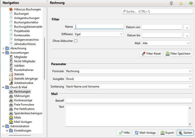 Die Rechnungen können für den Druck in ein PDF-Dokument ausgegeben werden oder per Mail an die Mitglieder versandt werden.