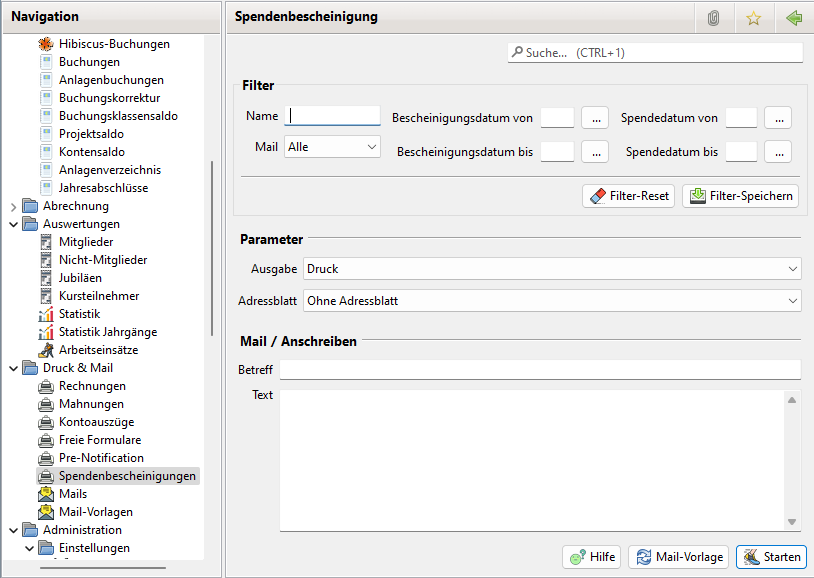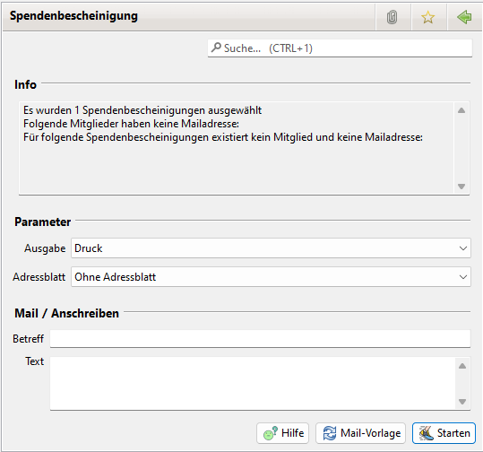 Durch Klick auf den Starten Button werden die Spendenbescheinigungen an die Mitglieder versendet bzw. gedruckt.
