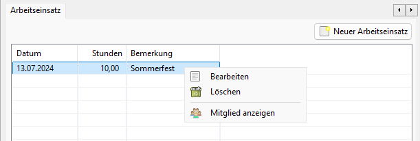 Danach kann hier beim Erfassen von Arbeitsstunden im Feld Stunden auch ein negativer Wert eingetragen und damit die Sollstunden des Mitglieds erhöht werden. Damit kann man Dienstleistungen des Vereins, die mit Arbeitsstunden gegengerechnet werden können, einfach erfassen und abrechnen.