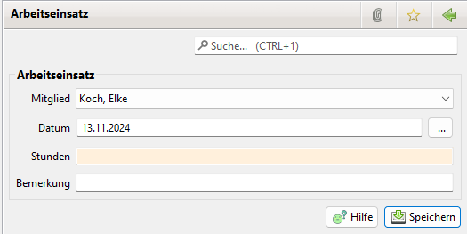 Im Dialog können neue Stunden für das Mitglied erfasst werden. Sie geben das Datum ein, an dem die Stunden geleistet wurden, die Anzahl der Stunden und, im Feld Bemerkung, was geleistet wurde.