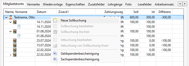 Geldspendenbescheinigung: Aktiv falls das Mitglied oder die Istbuchung ausgewählt ist