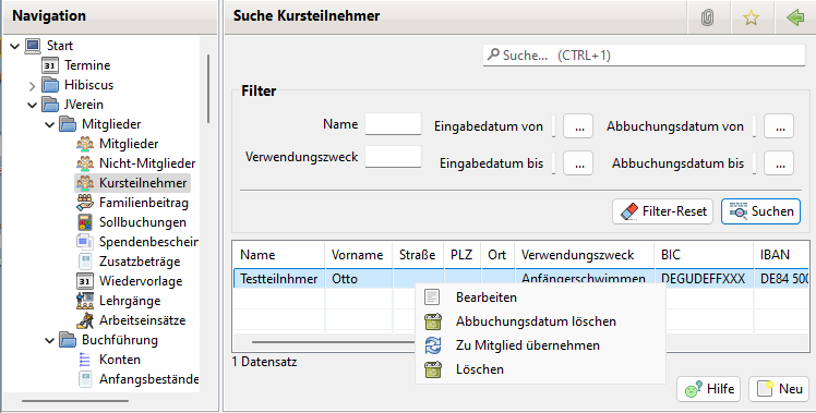 Anschließend sollte JVerein neu gestartet werden, damit der Menüpunkt "Kursteilnehmer" zur Verfügung steht.