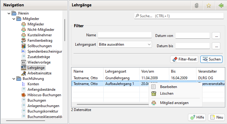 Anschließend sollte JVerein neu gestartet werden, damit der Menüpunkt "Lehrgänge" zur Verfügung steht.