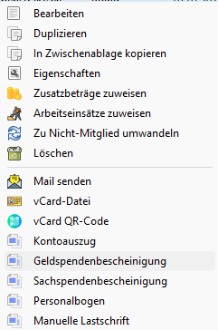 In der Liste der Mitglieder kann man mit einem Klick auf die rechte Maustaste ein Kontextmenü öffnen. Darin den Menüpunkt Geldspendenbescheinigung auswählen. In diesem Fall werden die Mitgliedsdaten komplett in die Spendenbescheinigung übernommen, die erste Buchung bestimmt das Spendendatum, der Betrag ist die Summe der Beträge aller Buchungen.