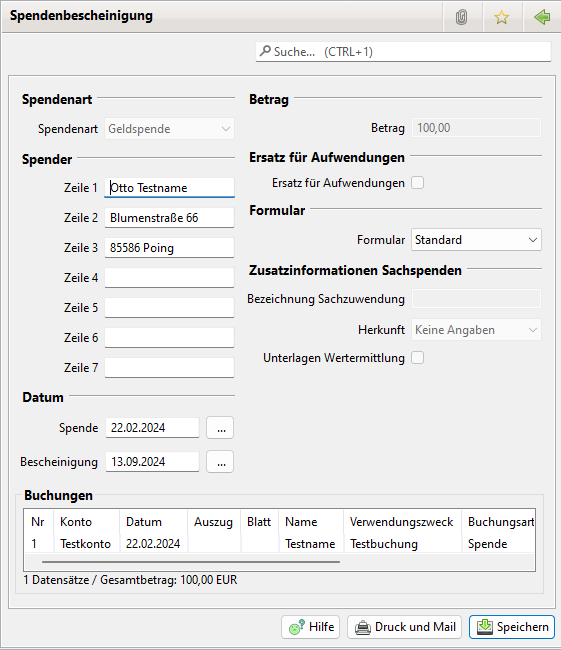 Das Erzeugen der Spendenbescheinigung erfolgt wie nachfolgend bei Geldspendenbescheinigungen beschrieben.