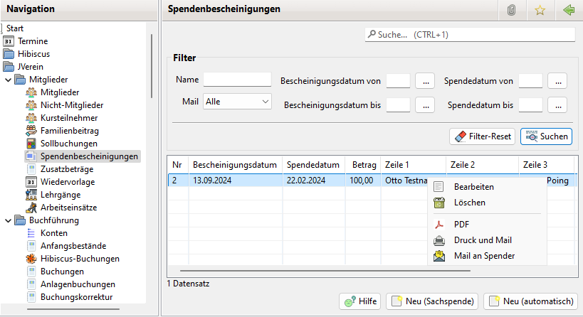 Mögliche Einstellungen zu Spendenbescheinigungen siehe Einstellungen.