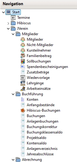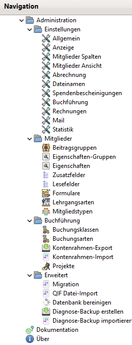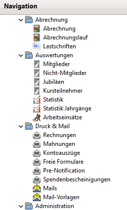 Das Navigationsmenü kann je nach aktivierten Programmfunktionen mehr oder weniger Einträge enthalten. Beispielsweise können Lehrgänge oder Arbeitseinsätze ausgeschaltet werden. In diesem Fall stehen die zugehörigen Programmfunktionen nicht zur Verfügung.